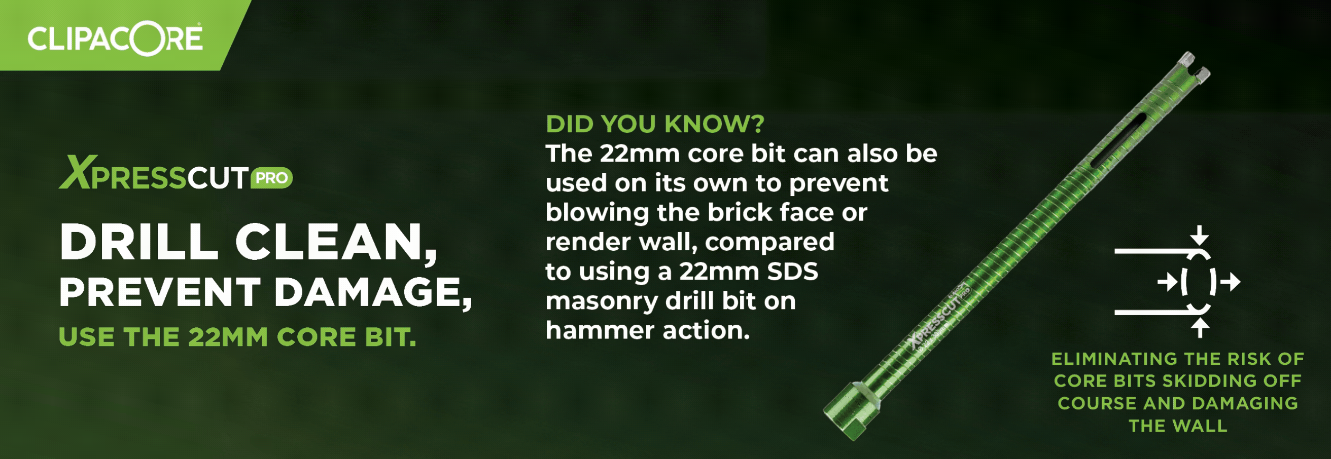- Specialist 22mm Core: The included 22mm core is 300mm long to navigate deep walls and can also be used on its own to drill clean pilot holes without blowing out the face of the brick, unlike a standard masonry bit on hammer action.