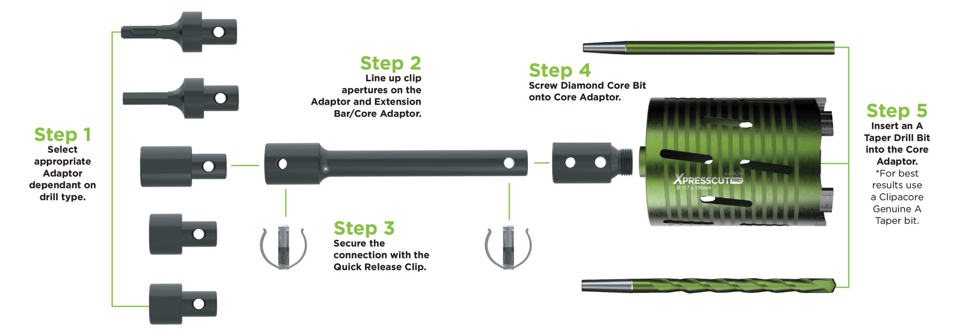 Step 2 & 3: Line Up Apertures and Secure the Connection: The Drill Adaptor (or extension) is connected to the Core Adaptor with or without an extension bar. All components feature precision-machined apertures that are lined up by sight. A U-shaped Quick Release Clip is then inserted through these apertures by hand, creating a secure, rotation-locked connection. This step completely removes the need for spanners, saving time and preventing the over-tightening that leads to seizing. You can use our Clipacore Extension bar or get an adapter for your own.