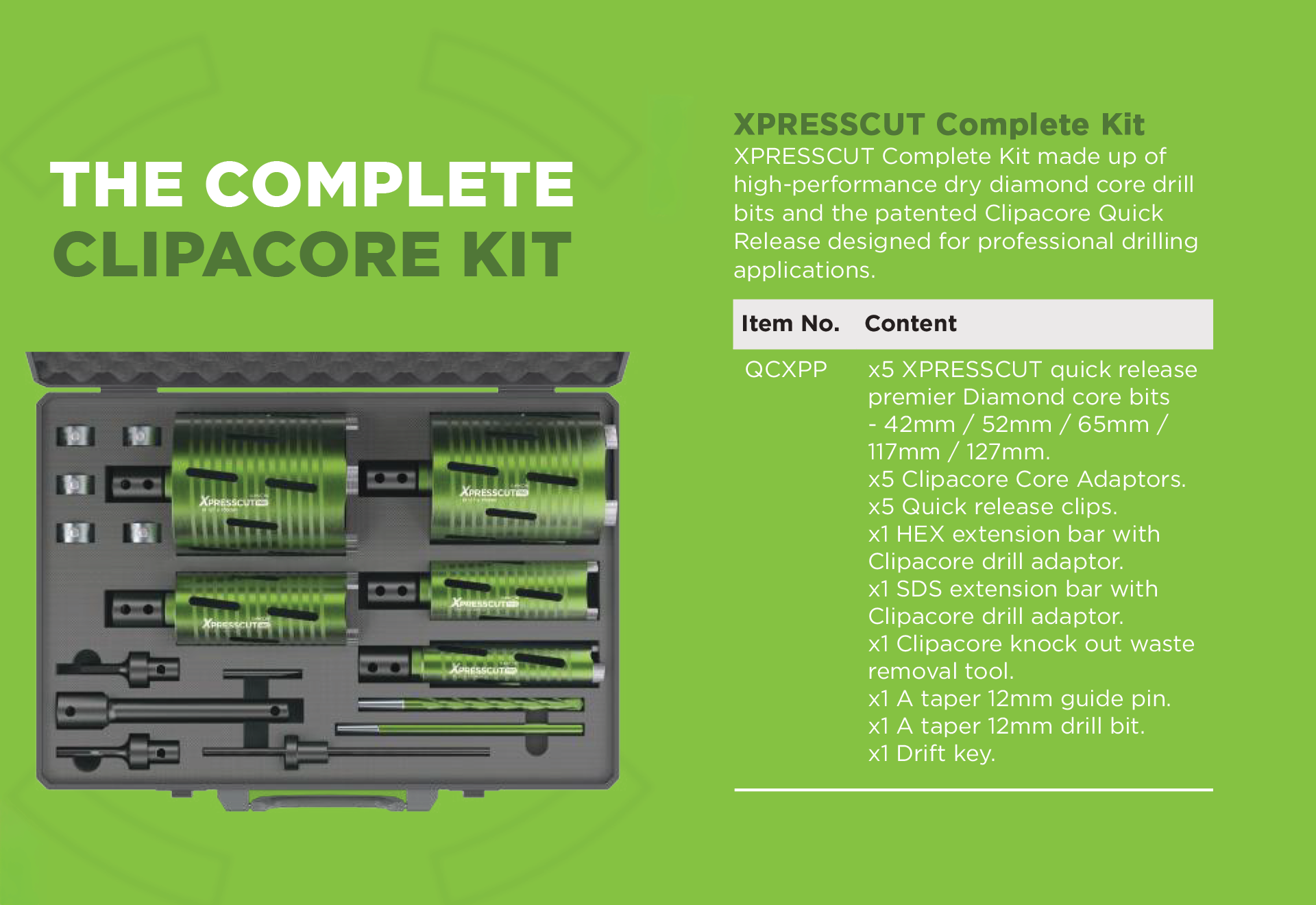 The XPRESSCUT Complete Kit is the definitive toolkit for professionals who demand performance, versatility, and efficiency. This comprehensive set combines five of the most common XPRESSCUT PRO core sizes with the full Clipacore quick-release system, all housed in a durable carry case.